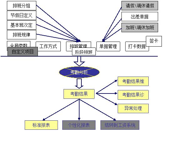 幾百家客戶的實踐證明,C6考勤軟件能夠解滿足大多數(shù)企業(yè)的考勤管理需求,即使這個企業(yè)的考勤制度相當?shù)膹碗s,C6軟件都能輕松應對,C6考勤流程圖如下所示: