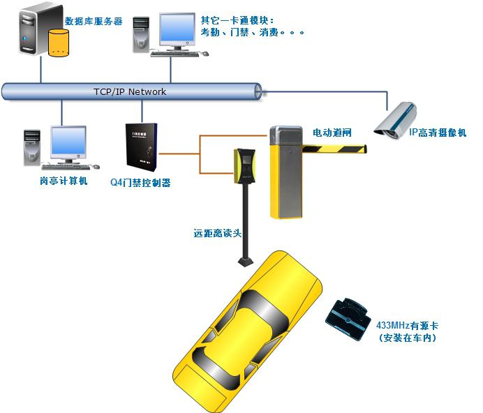 在車內(nèi)擋風玻璃合適位置安裝有源卡,選用最成熟的433MHz頻段有源卡,另加38KHz紅外激勵功能;該卡平時并不會發(fā)射電磁波,當靠近遠距離讀頭的時候,該讀頭首先用38KHz的紅外線來激勵和定位所捕捉到的有源卡,車內(nèi)的有源卡激勵之后,采用433MHz的頻率和讀頭一對一綁定通訊,一旦綁定之后,即使有另外一張卡進入感應范圍,系統(tǒng)也可以辨別,有效解決了433MHz定向讀卡的問題;遠距離讀頭讀到卡號之后,通過WG26格式和Q4門禁控制器通訊,Q4收到卡號之后,判斷權(quán)限,若有權(quán),則驅(qū)動道閘工作,并存儲和實時上報刷卡記錄,崗亭計算機收到記錄之后,立即啟動IP高清攝像機進行抓拍照片,整個過程1秒之內(nèi)完成(這個步驟可選,并非一定需要);閘機下方有兩組地感,車輛在未駛出地感之前不會落桿,防止砸車。