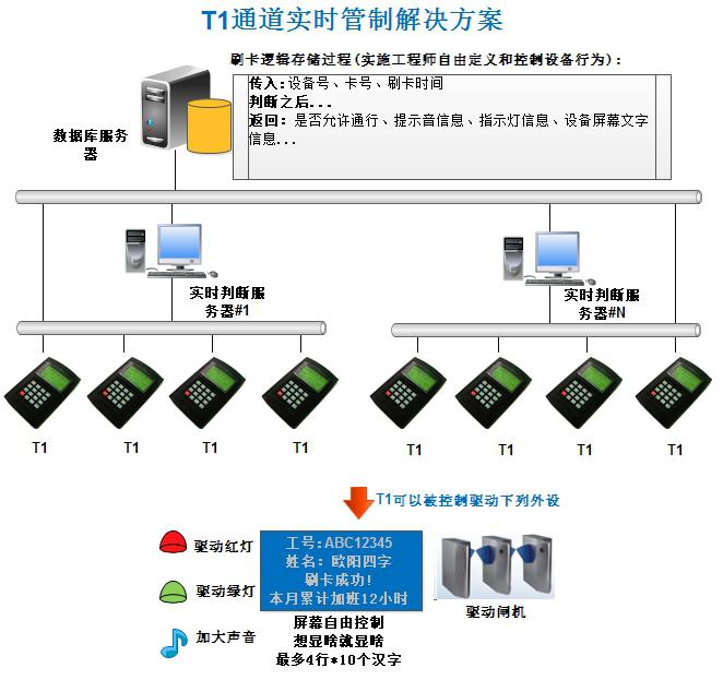 該公司人數眾多,對員工加班的刷卡必須先判斷是否要求其加班,否則刷卡拒絕,方案中,采用了多臺實時服務器連接T1實時判斷。