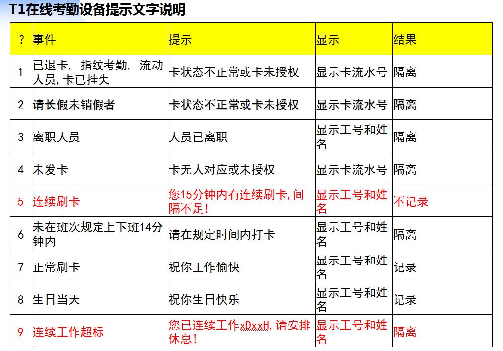 4.1 如果員工連續上班天數超過標準,還在繼續上班打卡,考勤機提示報警音并顯示“上班工時超標,打卡無效”字樣,但打卡記錄需要保存到改善數據中