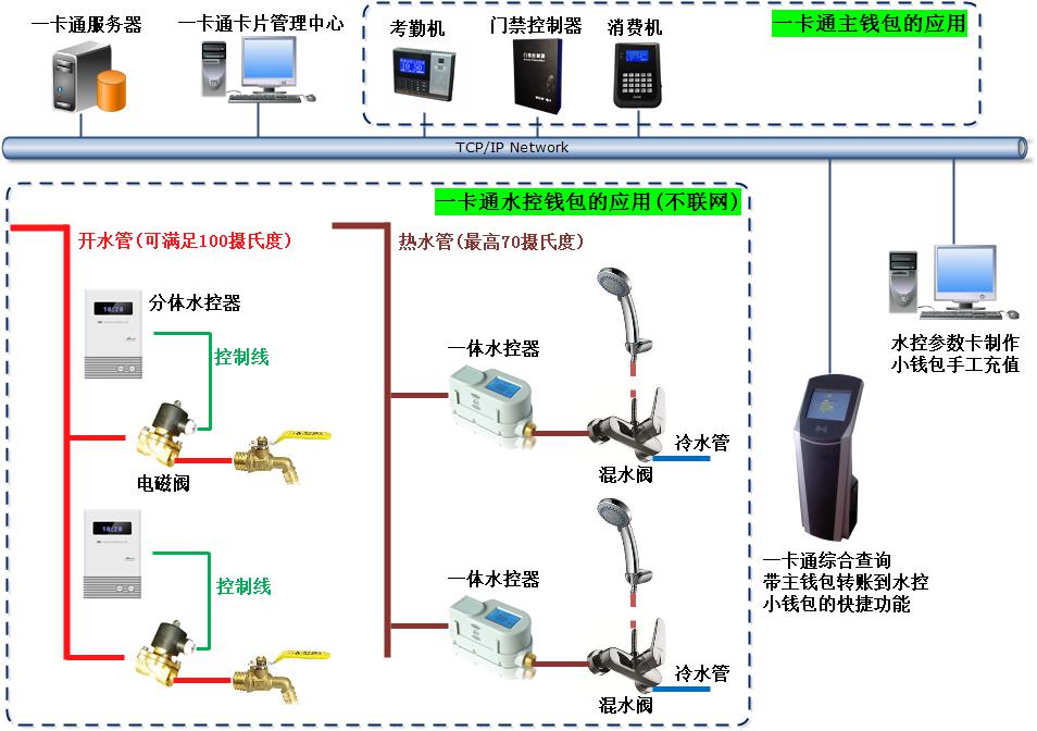 從系統的維護便利性和耐用性方面考慮,以及歷史證明,采用不聯網的方案是明智的,開水的控制用分體水控,非開水的用一體水控,設置階梯扣費方案,正常的用水量免費,超出部分需從水控錢包中扣費,水控錢包的錢最方便就是通過多功能查詢機,一點按鈕,即把主錢包(飯堂就餐錢包)的某個金額(例如10元)作為一筆消費記錄轉賬到水控錢包。