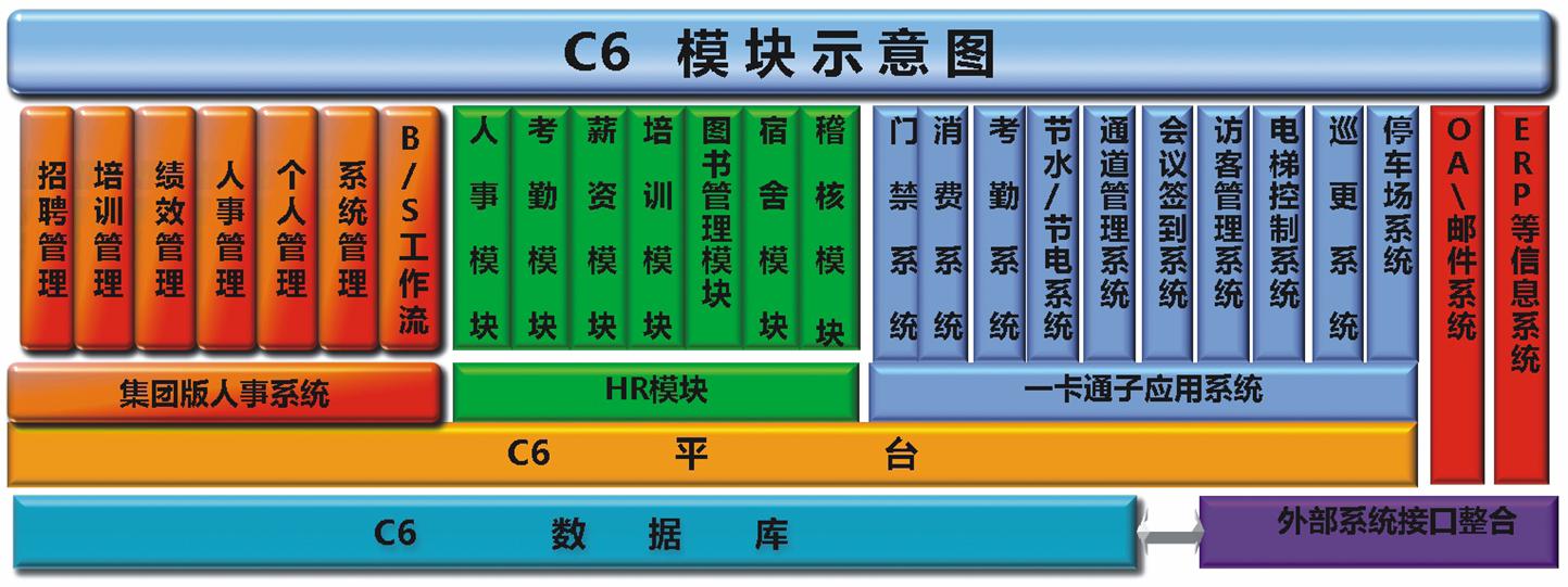 “一卡通”,從字面意義理解就是“一卡通用”,而企業一卡通,則是針對企業(主要是員工數較多的制造業企業)的“一卡通用”,具體涉及到的主要模塊就是下圖中【一卡通子應用系統】部分列舉的門禁、消費、考勤、節水、節電、通道、會議、訪客、電梯、巡更、停車場等。