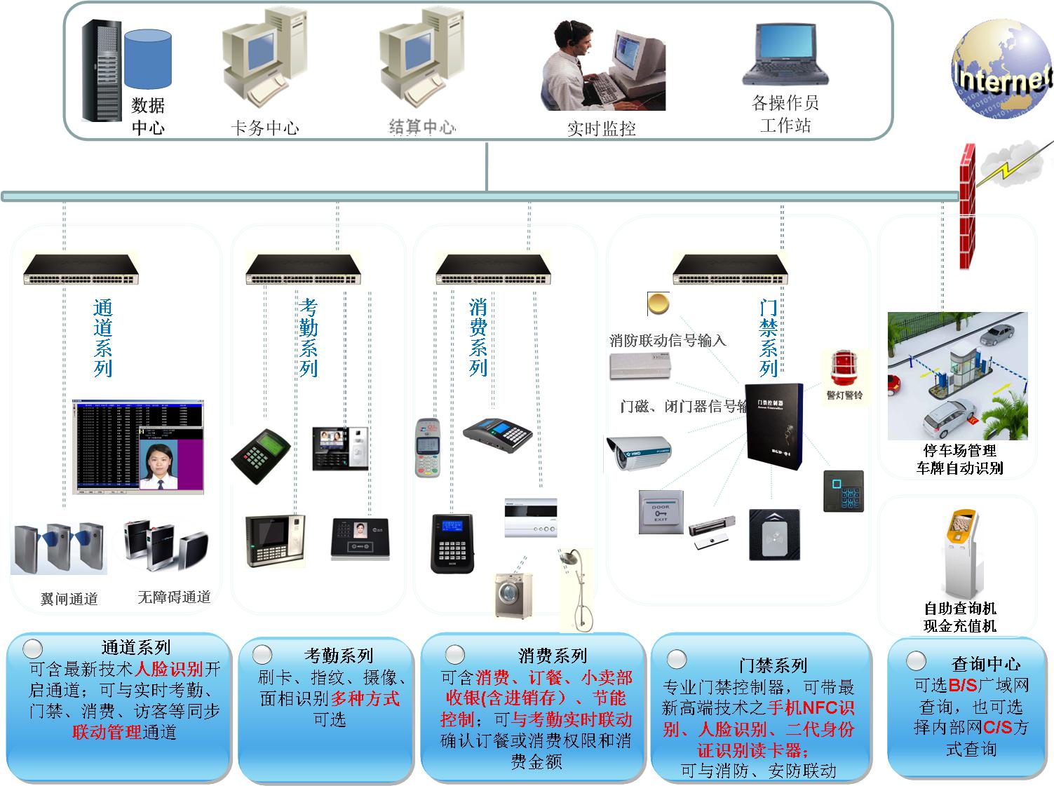 在企業一卡通中,從持卡人的角度,要盡可能做到持有同一張卡,在上述應用中均可通過刷卡授權或扣費來完成;而從系統管理的角度,希望這套系統是基于同一個管理體系的不同模塊,模塊與模塊之間既可以按操作角色分權使用,亦可共享數據,例如,人事部門錄入一遍的人員資料,發卡中心只需發一次卡即可。如果雖然為同一張卡,但需要多處錄入人事資料,多次發卡,那就不叫一卡通了;從網絡部署的角度,希望設備是構建在可以互通的同一個網上,如果涉及多地的集團公司,那么應該提供一種基于廣域網的集團解決方案,或VPN,或多庫同步合并,或云存儲云管理,總之,需要解決設備、軟件網絡互聯互通的問題。所以,對于什么是真正的一卡通通,可以概括為“卡通、庫通、網通”這“三通”。