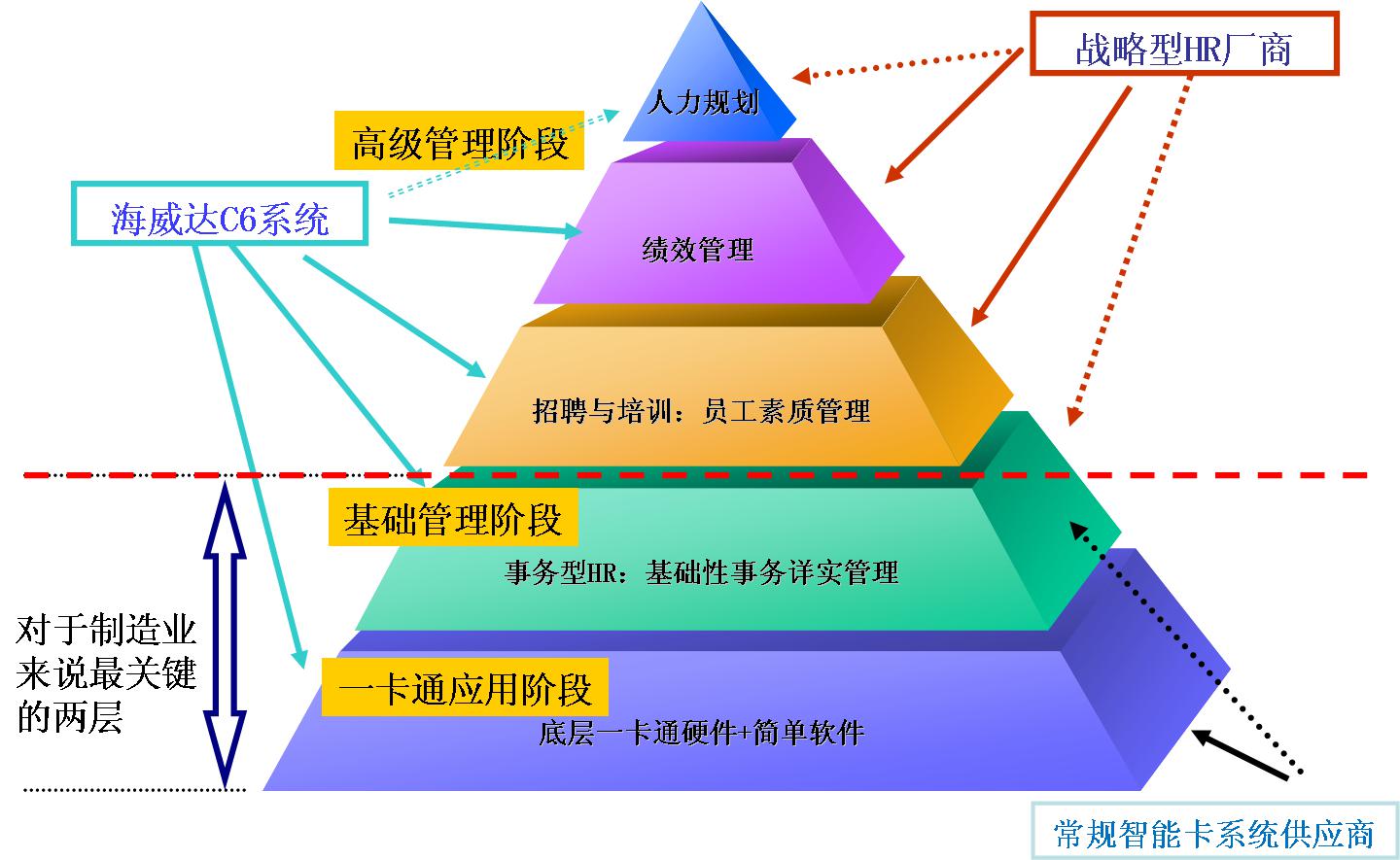 第一階段:一卡通應(yīng)用階段。這一層是構(gòu)成企業(yè)一卡通或人事管理的基礎(chǔ),人員和系統(tǒng)必須通過(guò)卡、設(shè)備作為載體才會(huì)和軟件系統(tǒng)有關(guān)聯(lián)關(guān)系,也是企業(yè)信息化建設(shè)中看得見(jiàn)、摸得著的部分,所以,我們列為第一層,那是必須的!這一層為圖中金字塔的底層,既表明了它的基礎(chǔ)作用,也表明了它的市場(chǎng)量和供應(yīng)商量在這個(gè)行業(yè)中都是最多的,所以,客戶(hù)如果單純選擇這一層的產(chǎn)品,簡(jiǎn)直可以用眼花繚亂來(lái)形容,但總的特征是:以硬件為主的供應(yīng)商不太擅長(zhǎng)具體應(yīng)用軟件,銷(xiāo)售的利潤(rùn)靠硬件來(lái)體現(xiàn),人員配備上重硬不重軟;以軟件為主的供應(yīng)商屬于二道販子,價(jià)格高,對(duì)硬件功能理解和掌控不夠,涉及到硬件的二次開(kāi)發(fā)受限很大,靠軟件來(lái)體現(xiàn)利潤(rùn),人員配備上重軟不重硬。